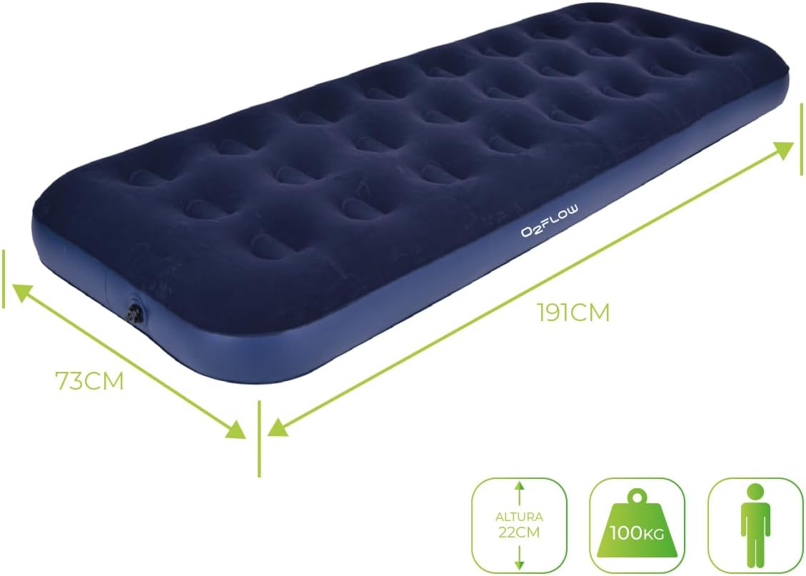 Colchão Inflável Solteiro Multiuso Até 100 kgs O2Flow O Colchão Inflável Solteiro O2Flow é perfeito para servir como cama extra para receber suas visitas, acomodar as crianças para brincarem, assistir seus filmes favoritos em qualquer lugar da casa, utilizar em acampamentos ou onde você precisar! PVC resistente em toda a sua estrutura, conta com um revestimento aveludado na parte superior que torna sua superfície extremamente confortável e facilita a aderência do lençol ou dispensa sua utilização. Além disso, suas ondulações proporcionam o ajuste do corpo, oferecendo um descanso agradável e ad...