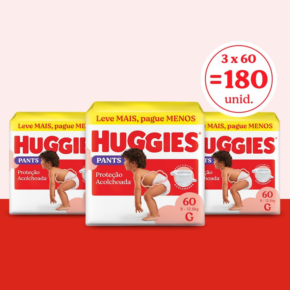 A Fralda Huggies Proteção Acolchoada Pants Tamanho G, com 180 unidades, é ideal para bebês em fase ativa que precisam de proteção e conforto. Supreme Care Roupinha agora é Proteção Acolchoada: com o mesmo cuidado e proteção de sempre. Abraço confortável para barriguinha e perninhas. Previne marquinhas e oferece até 12 horas de proteção contra vazamentos*. Seu formato tipo roupinha é fácil de vestir e acompanha cada movimento do bebê. Com cintura super macia e melhor proteção de Huggies* é escolha ideal para quem busca conforto, praticidade e segurança em todos os momentos do dia. *Desempenho p...