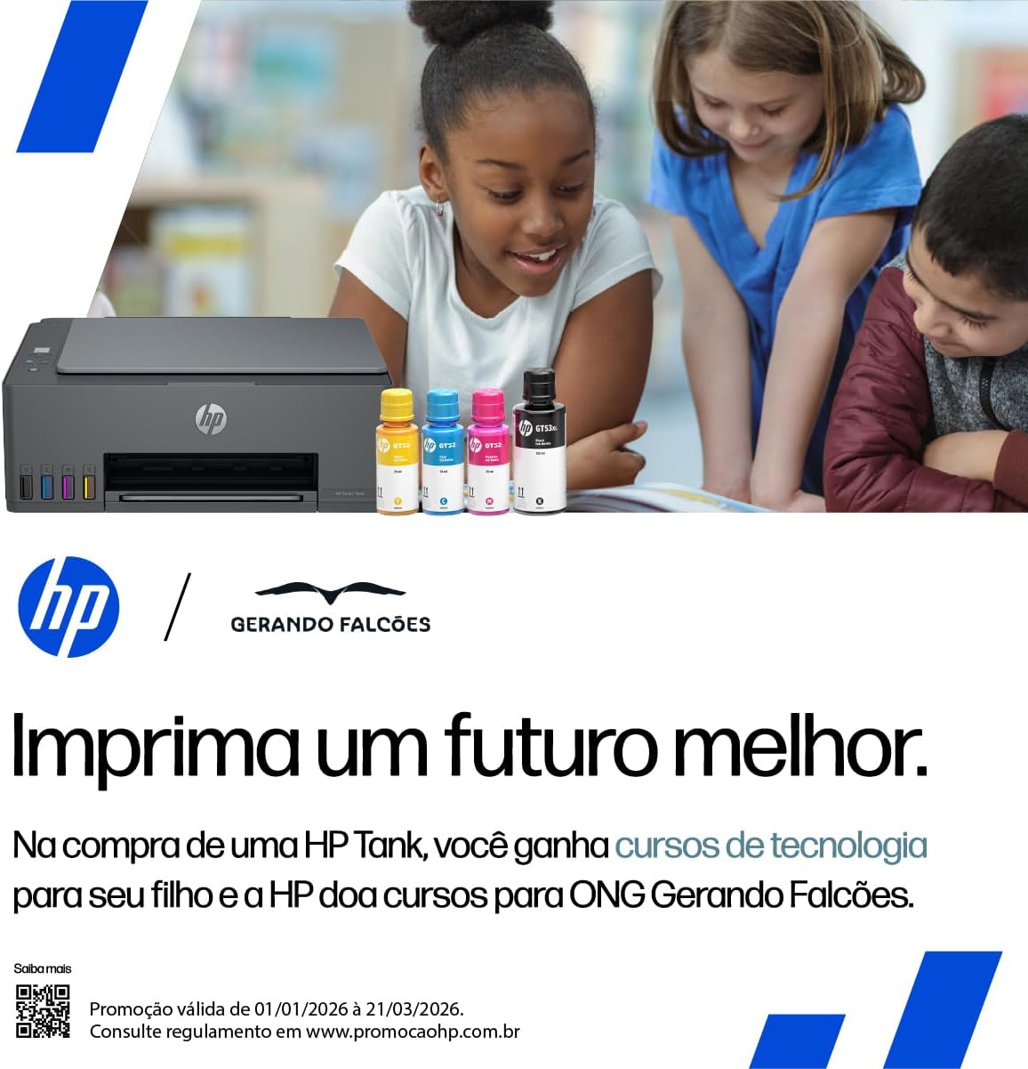4A8D5A Impressora multifuncional HP Smart Tank 581; 2 Frascos de tintaoriginal HP GT53XL preto (135 ml); 1 Frasco de tinta original HP GT52 ciano (50ml); 1 Frasco de tinta original HP GT52 magenta (50 ml); 1 Frasco de tinta originalHP GT52 amarelo (50 ml); Cabeçote de impressão HP Smart Tank; Guia deconfiguração; Guia de referência; Panfleto de cuidados com a tinta; Panfletoregulamentar; Panfleto de garantia; Cabo de alimentação