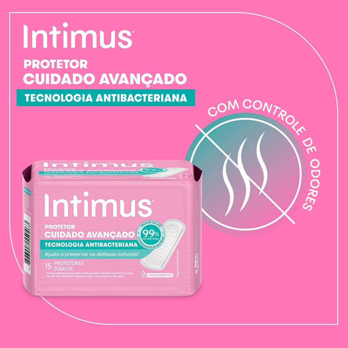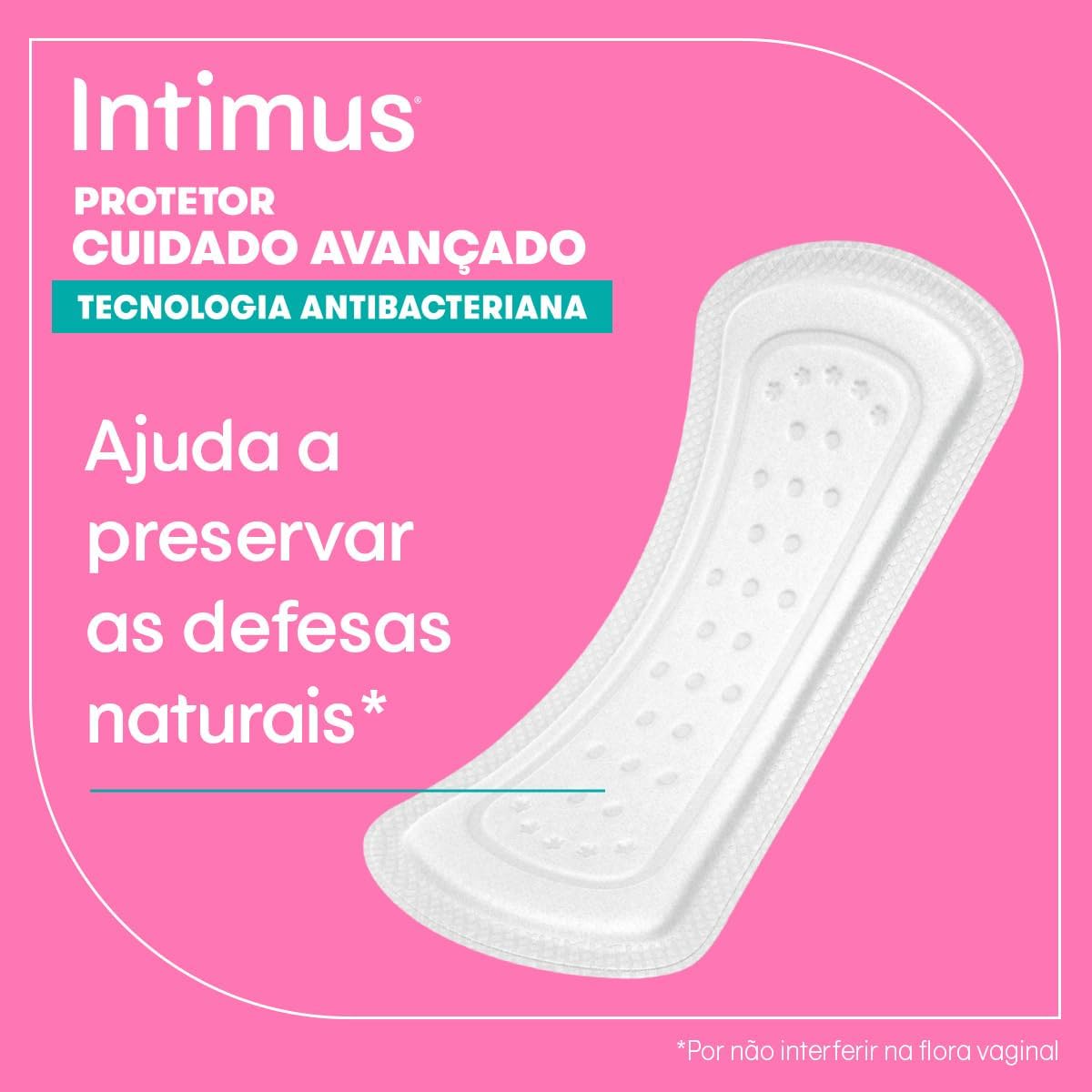 Intimus é a marca completa no mercado de cuidados femininos, garantindo a proteção e o conforto que você precisa todos os dias.O protetor diário Intimus com tecnologia antibacteriana ajuda a preservar em até 99% o crescimento de bacterias* no protetor ajudando a preservar as defesas naturais da zona íntima.*Bactérias que podem causar mal odor como e. colis, s. aureaus e c. albicans. Quantidade por Pacote: 80 unidades; Protetor sem abas.